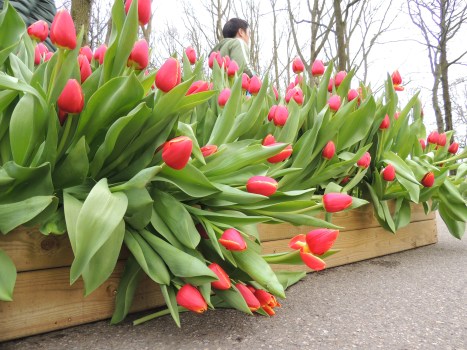Tiens, quelques photos qui annoncent le printemps. Ces tulipes n’ont pas fleuri ici…En fait, elles ont probablement la même allure qu’au moment où je les ai vues, il y a une dizaine de jours à Keukenhof, ce grand jardin néerlandais situé près de l’aéroport de Schipol. Dans les parterres manucurés, les crocus, quelques narcisses, des variétés hâtives de tulipes à la tige très courte, des muscari. L’explosion de tulipes se trouvait à l’intérieur, à l’abri des nuits trop froides. Les Néerlandais ont eu froid eux aussi cet hiver.