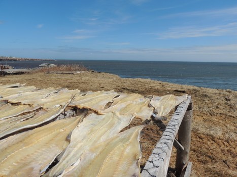 Il n’y a plus de morue. En tout cas plus assez pour faire vivre la tradition et remplir nos assiettes de poisson local mais, en Gaspésie, quelques irréductibles qui se comptent sur moins de doigts qu’en contient une seule main, perpétuent la technique de préparation de la morue salée-séchée, héritage des marchands jersiais. La Gaspé Cured s’en inspire gaspecured.com . Quand je suis arrivée à Sainte-Thérèse-de-Gaspé, chez Lelièvre, Lelièvre et Lemoignan, une dizaine d’hommes s’affairaient à étaler la morue sur les vigneaux: ces installations artisanales faites de pieux d’environ un mètre coupés dans des arbres de petit diamètre sur lesquels est fixé un treillis à grosses mailles. Et sur ce treillis, ils étendaient la morue ouverte en deux, taillée pour être bien plate de manière à sécher le plus également possible.
